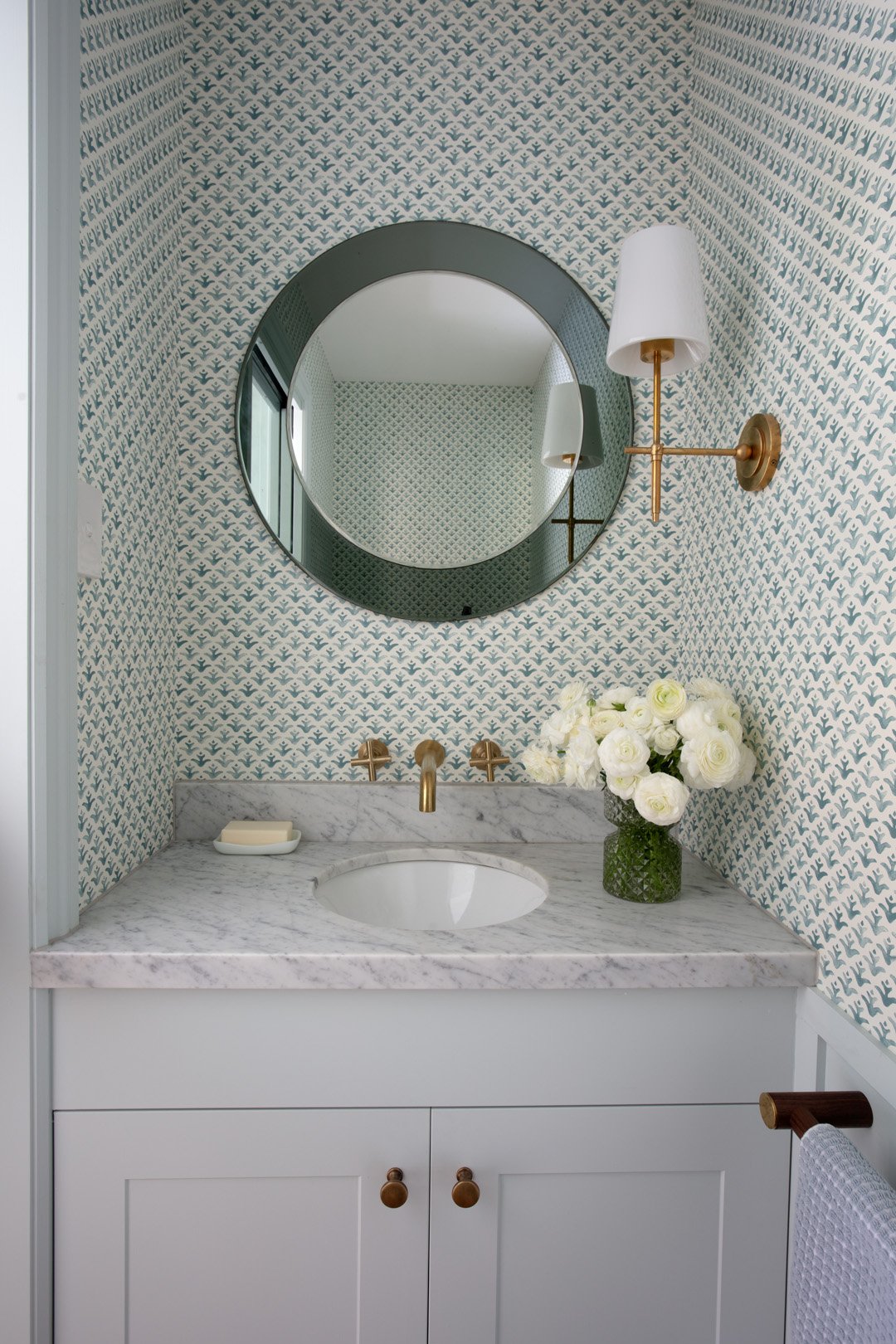 This vintage Italian glass mirror in the powder room of our Coorparoo project was chosen by our clients after a lot of research and carefully considering the overall feel of the space. Photograph: John Downes