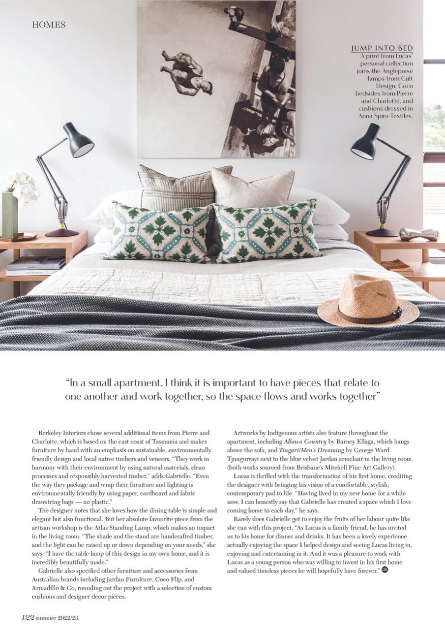 Bedroom interior with bed, decorative pillows, a straw hat, nightstands with lamps, framed black-and-white artwork, and a description of interior design elements.
