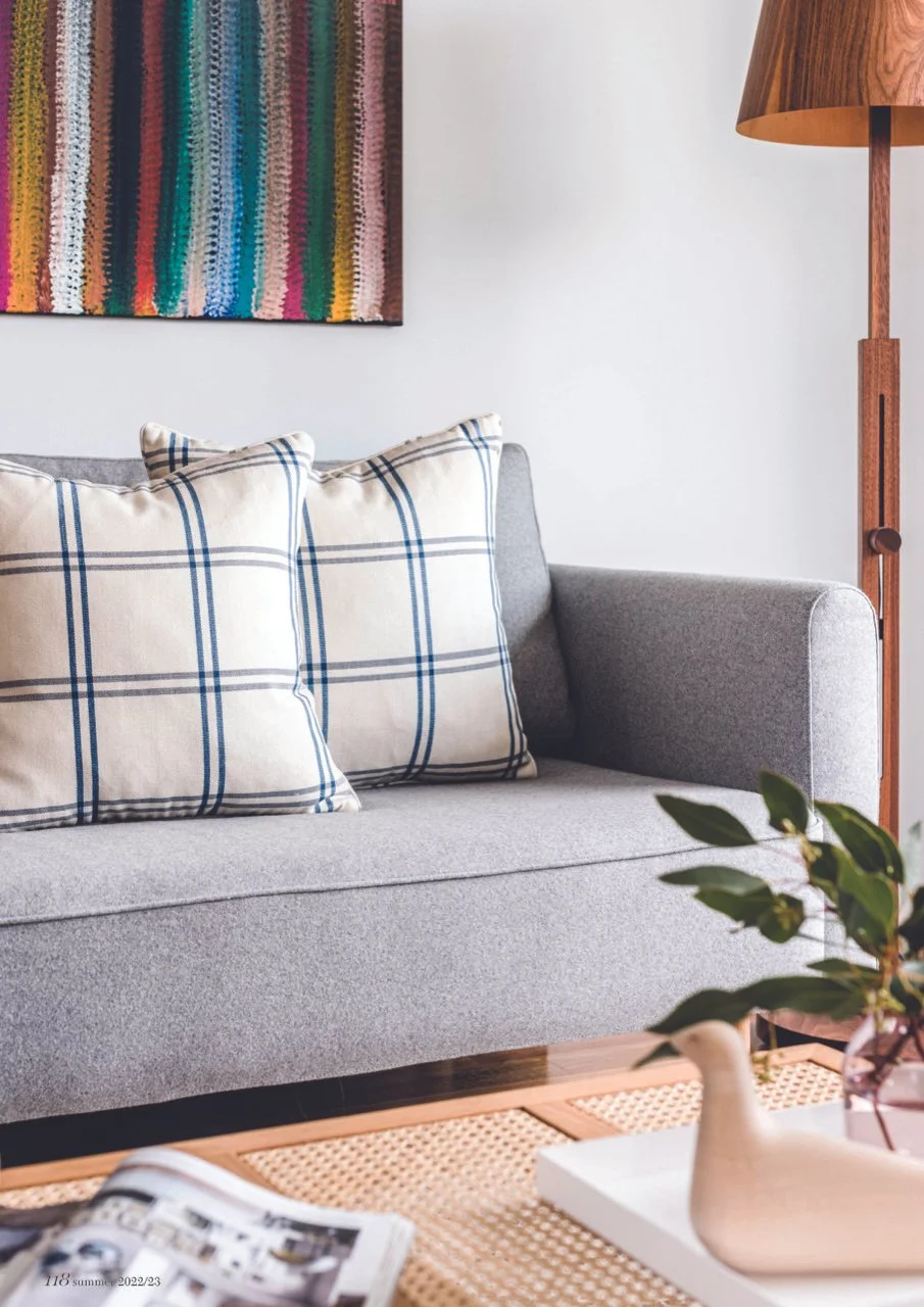 Interior of a living room with a gray sofa, two plaid pillows, a colorful abstract wall art, a wooden floor lamp, a wicker coffee table with a potted plant and a ceramic swan ornament, and a magazine on the table.