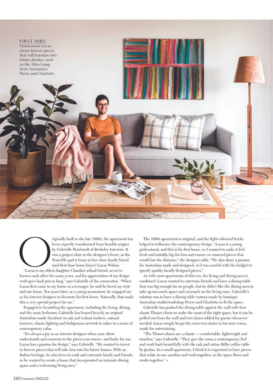 Living room with a sofa, a person sitting and smiling, decorative pillows, a large plant in a wicker basket, a wooden coffee table with magazines and a vase, a tall wooden floor lamp, and colorful abstract artwork on the wall. Text about first homes
