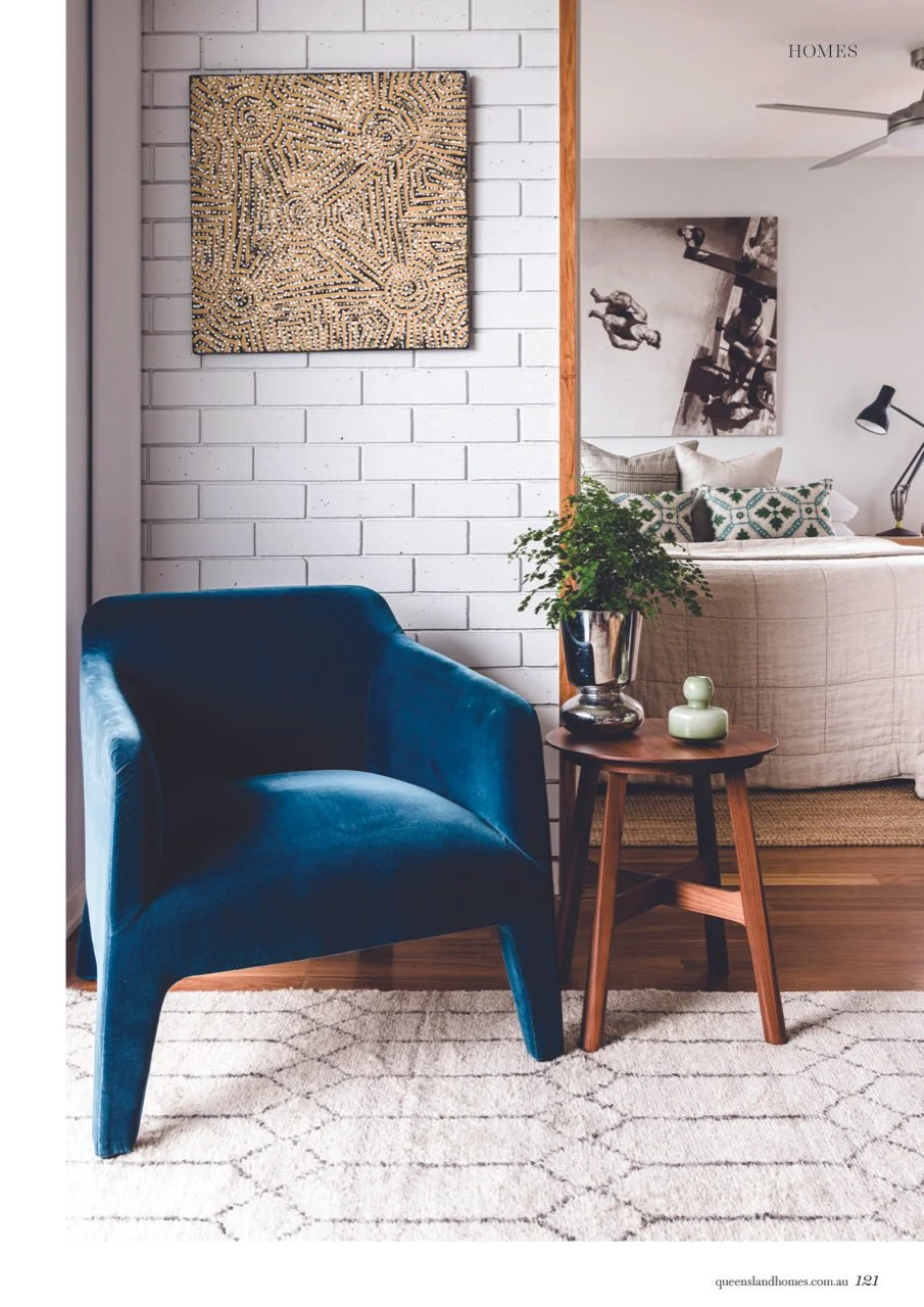 Living room corner with a blue velvet armchair, a small wooden side table with a green vase and plant, a beige sofa with patterned pillows, framed wall art, and a brick accent wall with a yellow, black, and white dot pattern painting.